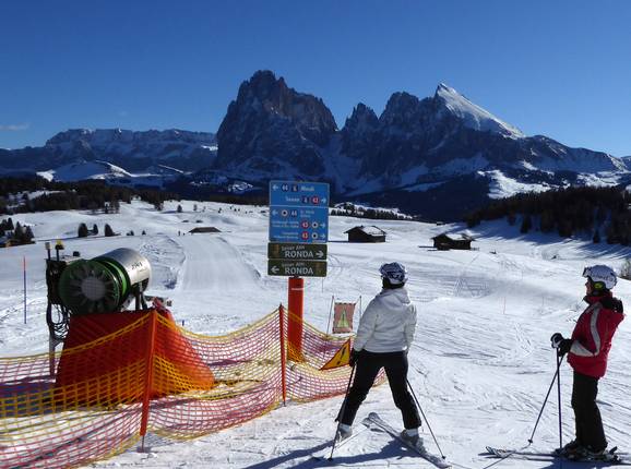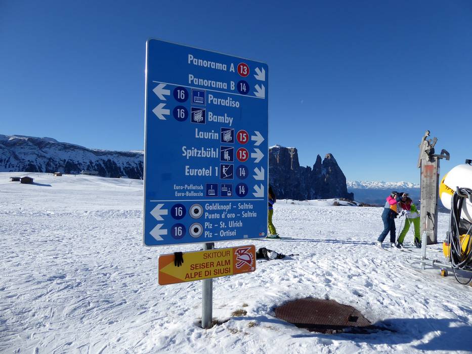 Orientierung (Pistenplan, Informationstafeln, Ausschilderung) und Sicherheit im Skigebiet Seiser Alm (Alpe di Siusi)