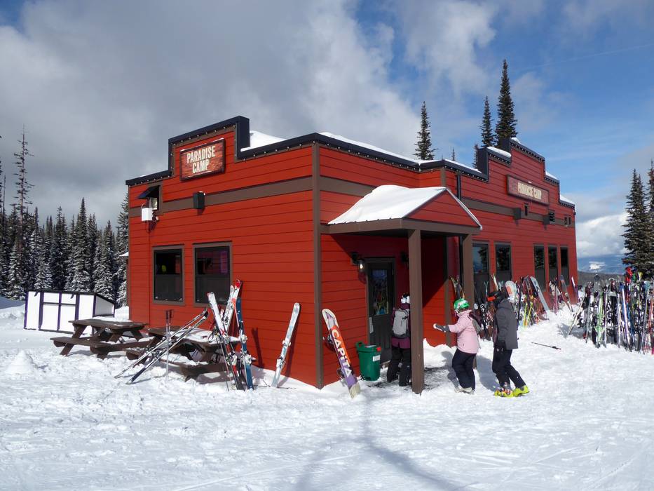 Das gemütliche und rustikale Paradise Camp befindet sich mitten im Skigebiet und bietet Frühstück und Mittagessen. Hier wird man bedient und es gibt neben guten Speisen auch eine große Getränkeauswahl. Am offenen Kamin kann man sich aufwärmen.
