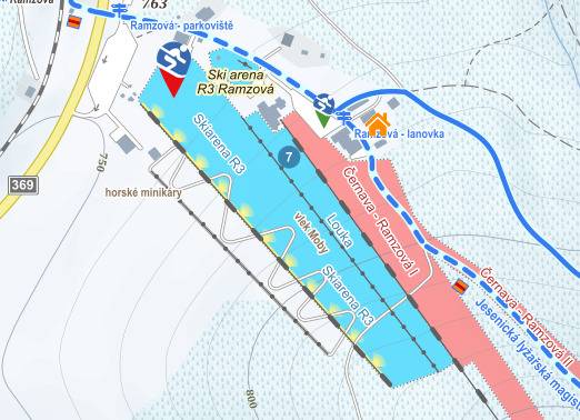 Ramzová (0,4 km), Ostružná (1,2 km) Orte am Skigebiet