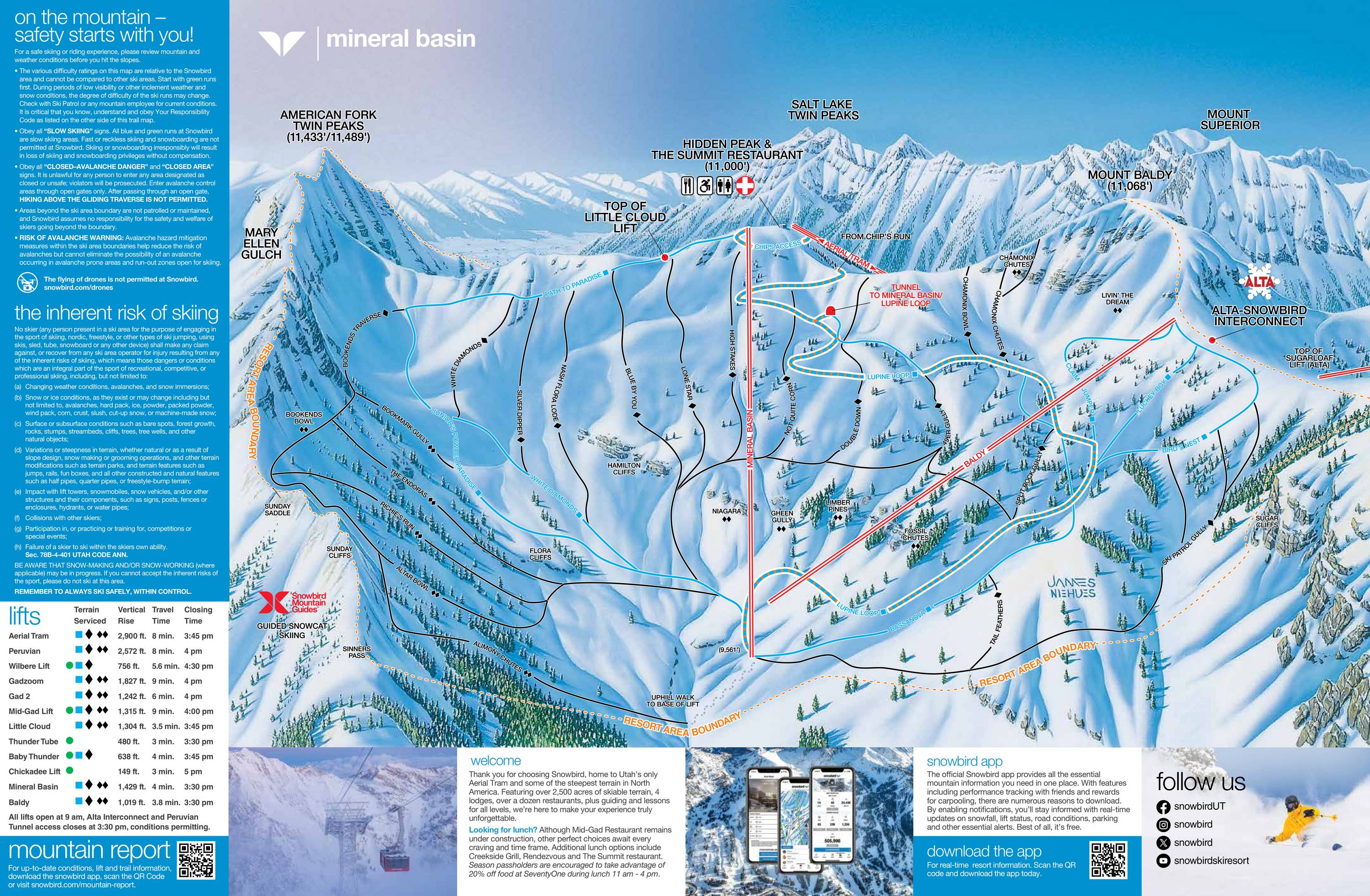Der Pistenplan stellt das Skigebiet Snowbird sehr gut dar. Die Pisten und Lifte sind klar eingezeichnet. Die Bereiche Peruvian Gulch und Gad Valley sowie Mineral Basin werden auf zwei Plänen dargestellt. Wichtige Punkte im Skigebiet sind angegeben. Weiterführende Informationen zur Gastronomie, zur Skischule, zum Skiverleih und den Shops sind vorhanden.