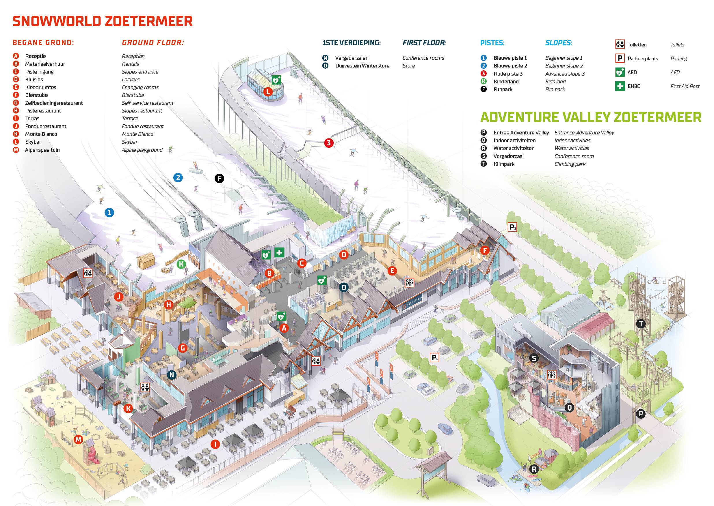 Orientierung (Pistenplan, Informationstafeln, Ausschilderung) und Sicherheit im Skigebiet SnowWorld Zoetermeer