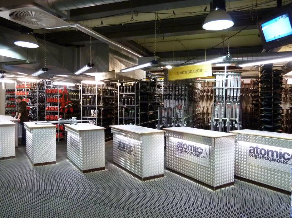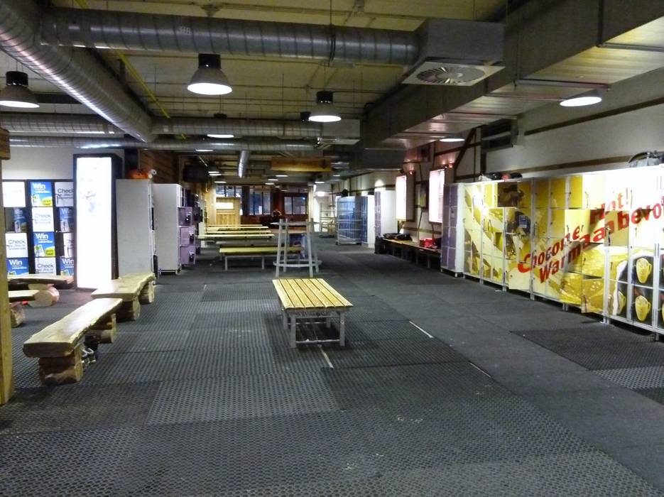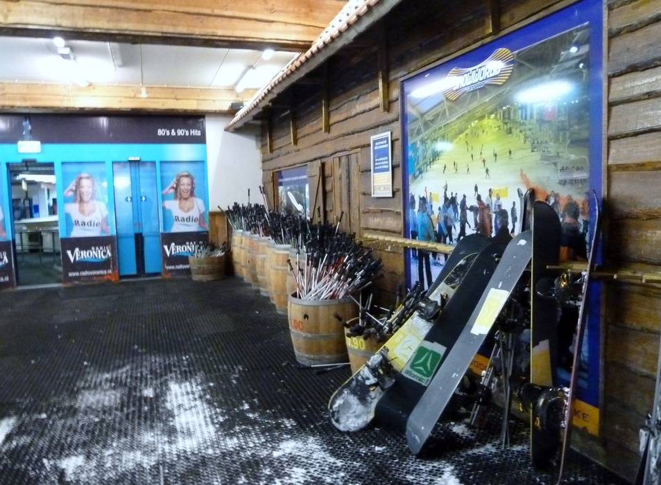 Der Eingang in die Skihalle Ausgabe für das Leihmaterial Umkleidebereich mit Schließfächern Blick von der Bergstation Richtung Nordsee Eine große Auswahl an Skistöcken Blick auf die SnowWorld Zoetermeer