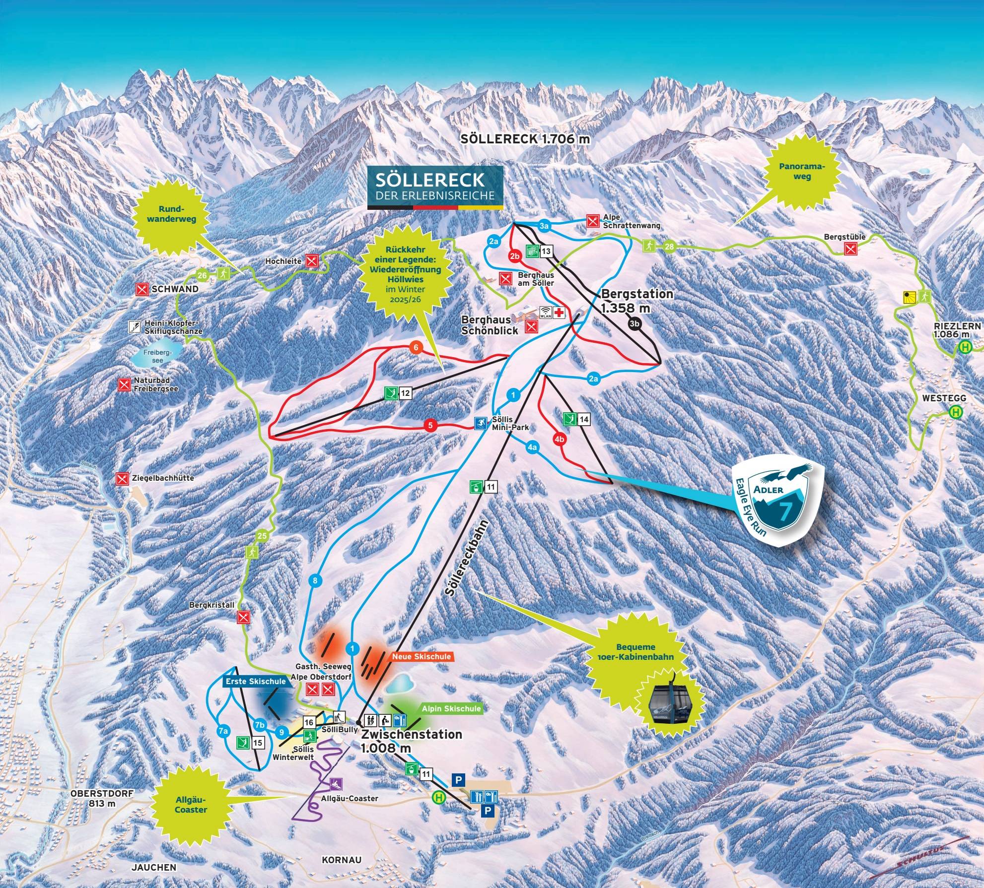 Der Pistenplan bildet das Skigebiet Söllereck sehr gut ab. Vor Ort bekommt man einen eigenen Pistenplan, der nur das Söllereck abbildet und nicht die ganze Region Oberstdorf Kleinwalsertal. Alle Highlights sind im Detail beschrieben. Es könnten jedoch Informationen und Namen von den Liften an einigen Stellen ergänzt werden.