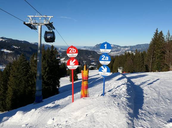 Die Ausschilderung auf den Pisten ist klar und eindeutig sowie einheitlich. Große Informationstafeln inklusive Öffnungsstatus und Infoscreens an wichtigen Punkten im Skigebiet machen die Orientierung einfach. In allen Skigebieten von den Bergbahnen Kleinwalsertal Oberstdorf findet man einheitliche Beschilderungen. Jedes Skigebiet ist mit einer eigenen Farbe markiert.
