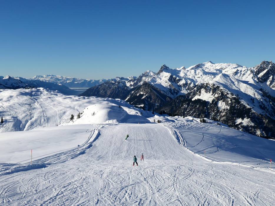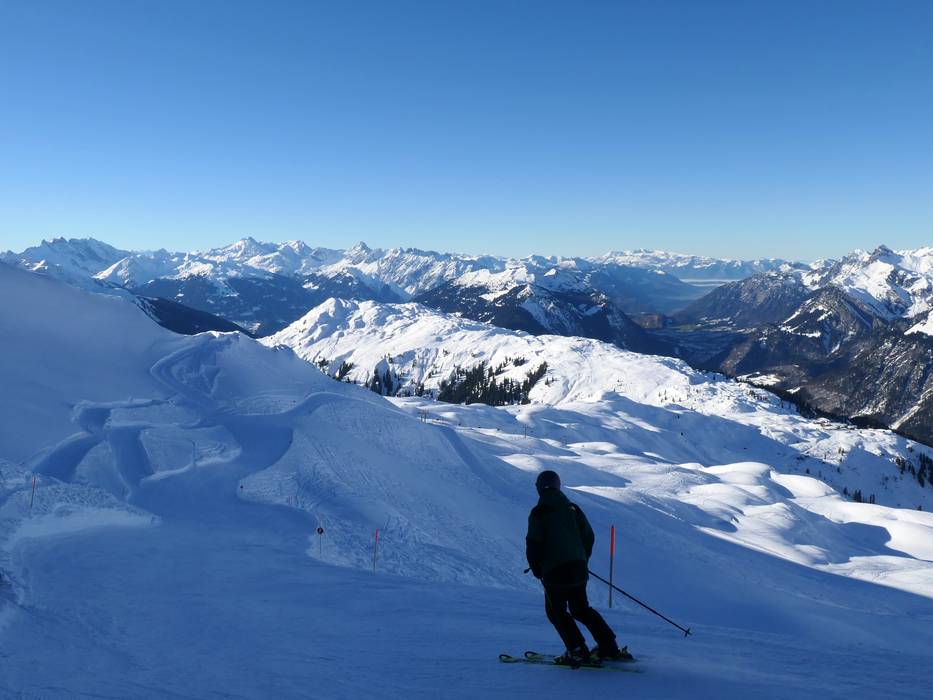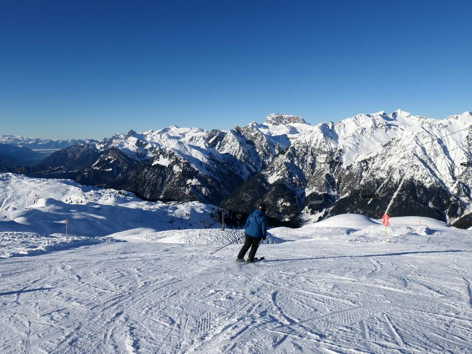 Herrliches Panorama über das Skigebiet bis hinunter ins Walgau - Abfahrt Untermuri