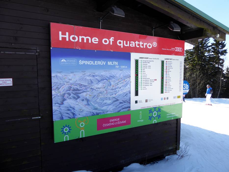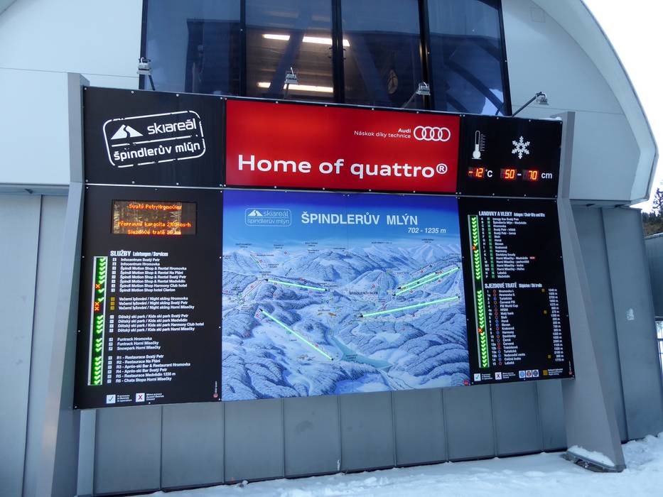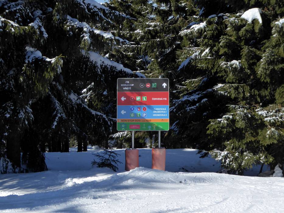 Orientierung (Pistenplan, Informationstafeln, Ausschilderung) und Sicherheit im Skigebiet Spindlermühle (Špindlerův Mlýn)