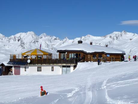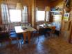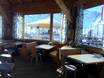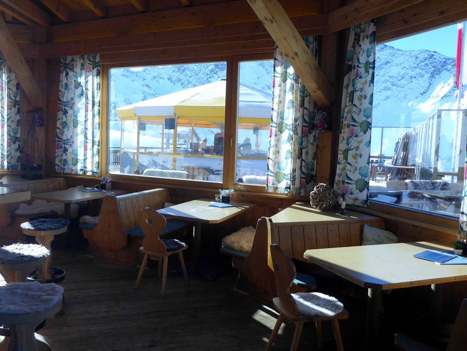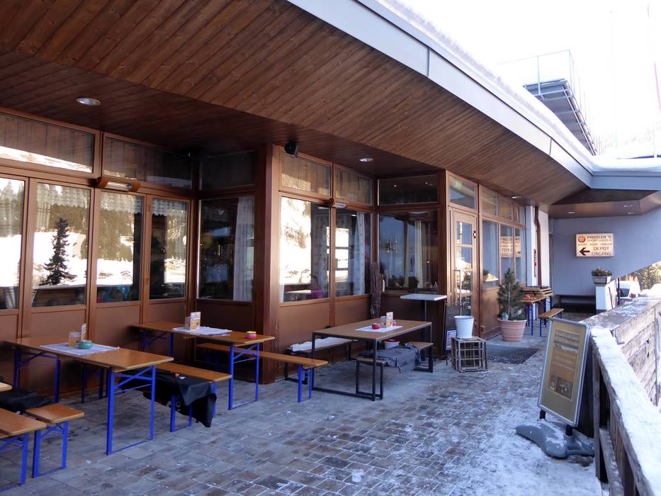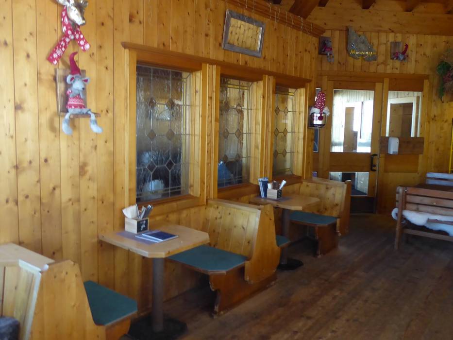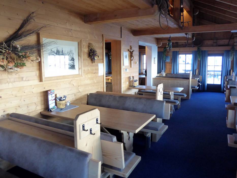 Die gemütliche Skihütte hat zwei Bereiche. Im Obergeschoss gibt es eine Bar mit Sonnenterrasse, unten ein Restaurant ebenfalls mit einer Sonnenterrasse.
