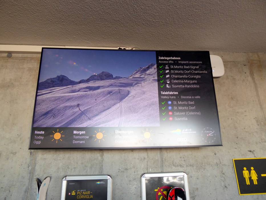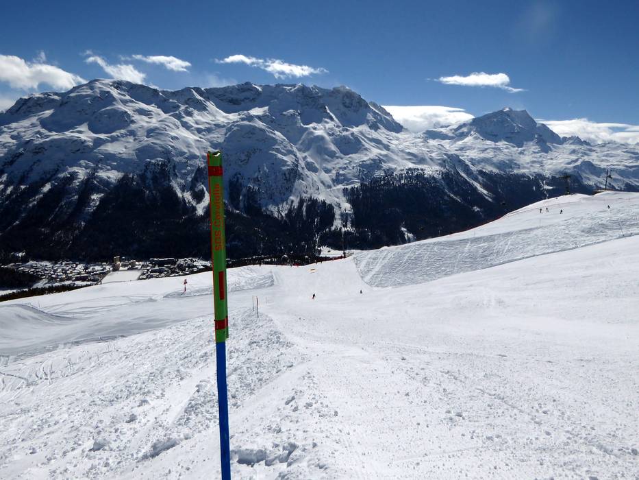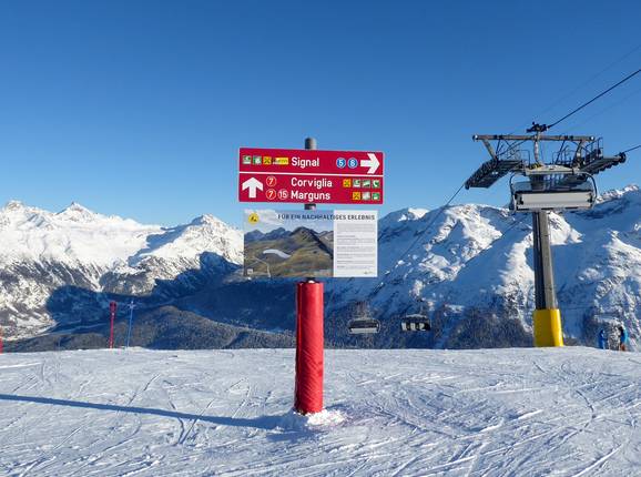 Orientierung (Pistenplan, Informationstafeln, Ausschilderung) und Sicherheit im Skigebiet St. Moritz – Corviglia