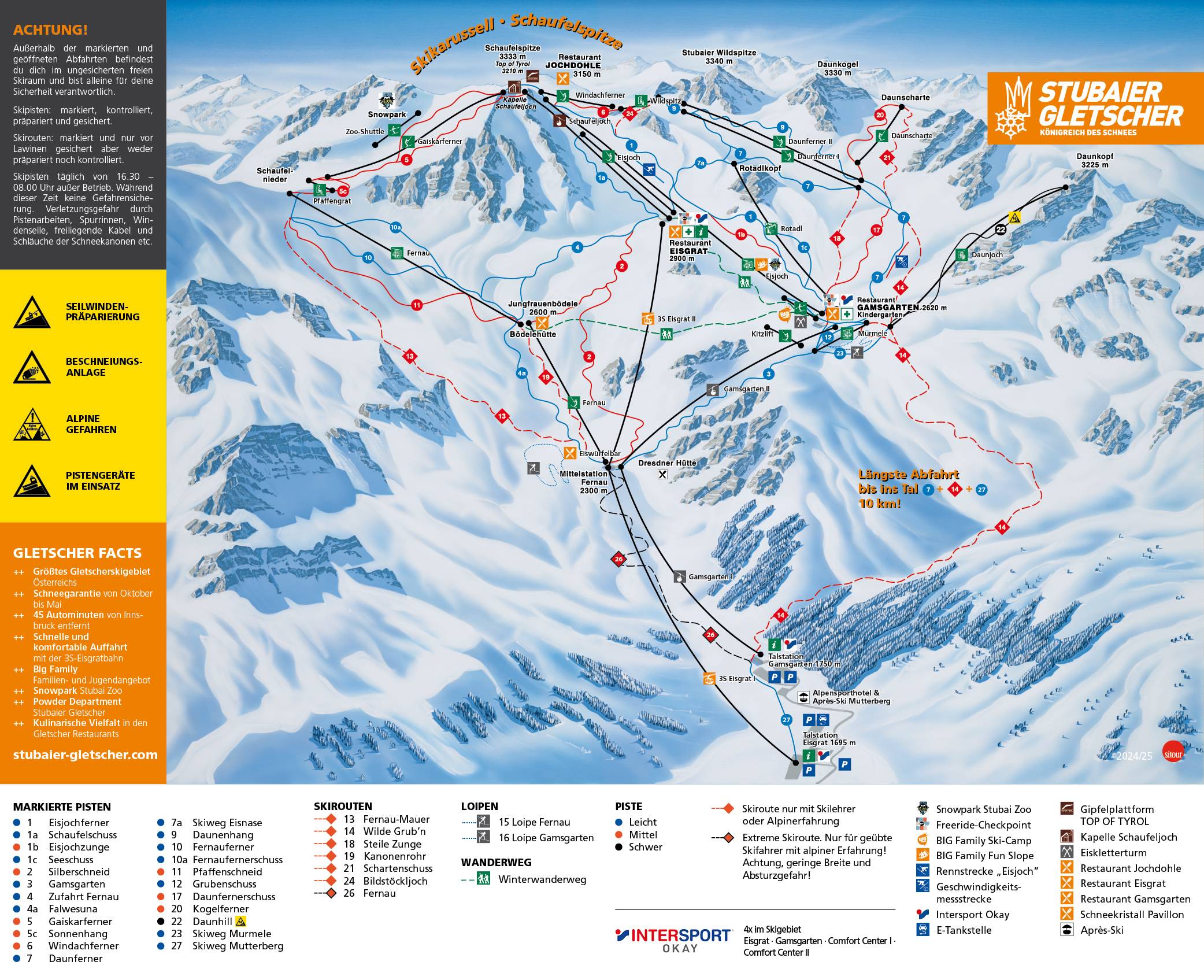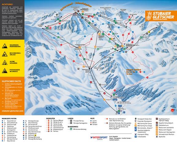 Im Pistenplan befinden sich Informationen zu Bahnen und Abfahrten sowie Informationen zu Bergrestaurants, Snowpark, Big Family, Skischulen, Skiverleih, Service, Eisgrotte, Events und Top of Tyrol Aussichtsplattform. Der Plan ist graphisch gut aufbereitet und sehr übersichtlich gestaltet.