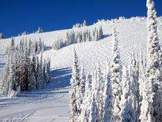Blick vom Sundance Mountain Richtung Sunburst Frischer Pulverschnee und überzuckerte Bäume in… Blick auf das Sun Peaks Resort