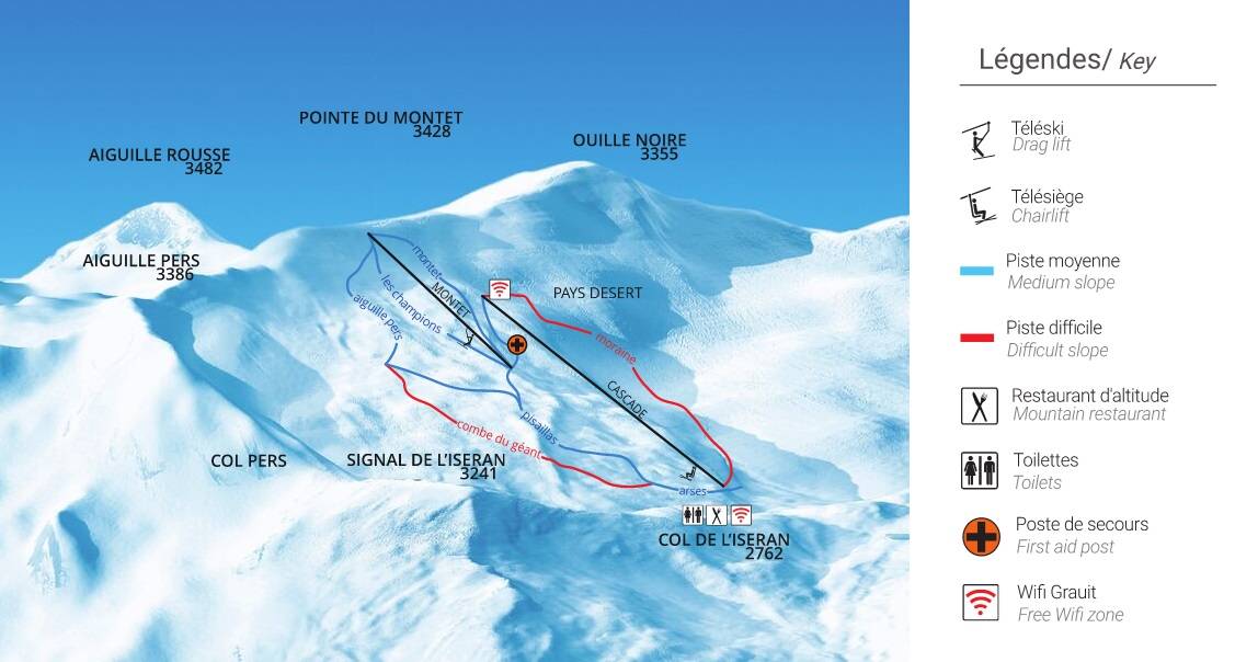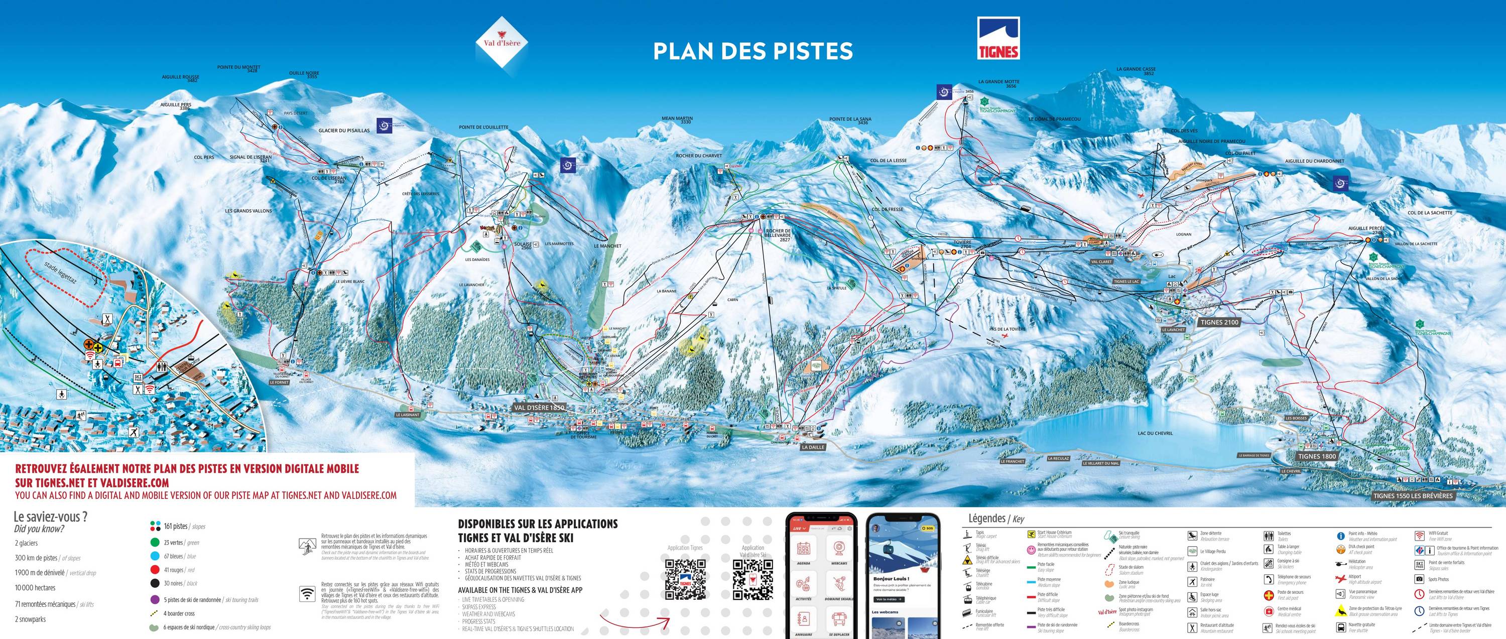 Der Pistenplan stellt das Skigebiet Tignes/Val d'Isère sehr gut dar. Es sind alle Skilifte und Pisten gut eingezeichnet. Es wird allerdings nur nach Gondelbahn, Sesselbahn, Schlepplift und Förderband unterschieden. Die genauen Details fehlen. Einige Teile des Skigebiets sind nochmals im Detail dargestellt.