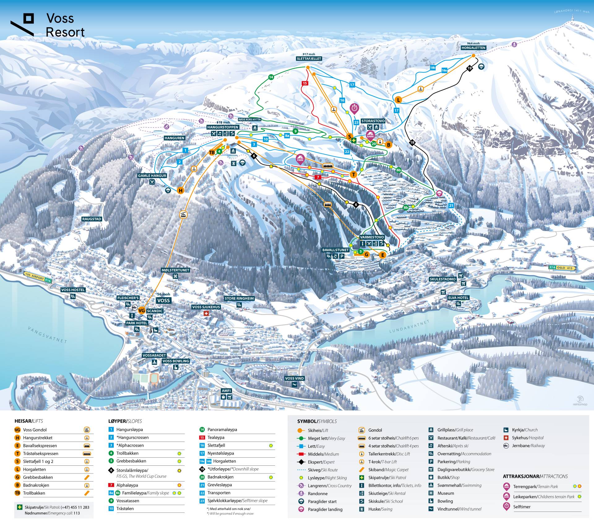 An den Talstationen findet man digitale Informationstafeln mit Live-Webcams und Infos zum Skibetrieb. Die Skipisten sind alle mit Nummern versehen. Somit findet man sich im Wintersportgebiet Voss Resort ganz leicht zurecht.