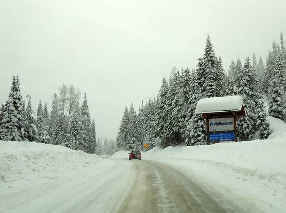 Das Skigebiet Whitewater liegt in den Kootenay Rockies unterhalb des Ymir Mountain in der Nähe von Nelson in British Columbia. Von Nelson geht es auf dem Highway 6 über den 958 m hohen Apex Summit bis zur Abzweigung zum Skigebiet. Über eine Bergstraße geht es dann hinauf zum Skigebiet Whitewater. Die ersten 3 km der Bergstraße sind noch asphaltiert und dann geht es über eine Kiesstraße bis zu den Sesselbahnen. Nach rund 5 km erreicht man die Dreiersesselbahn Glory Ridge mit begrenzten Parkmöglichkeiten. Nach weiteren 4 km erreicht man die Talstation der anderen Sesselbahnen. Hier gibt es ausreichend Parkplätze. Die Straße wird im Winter sehr gut geräumt und gepflegt.
