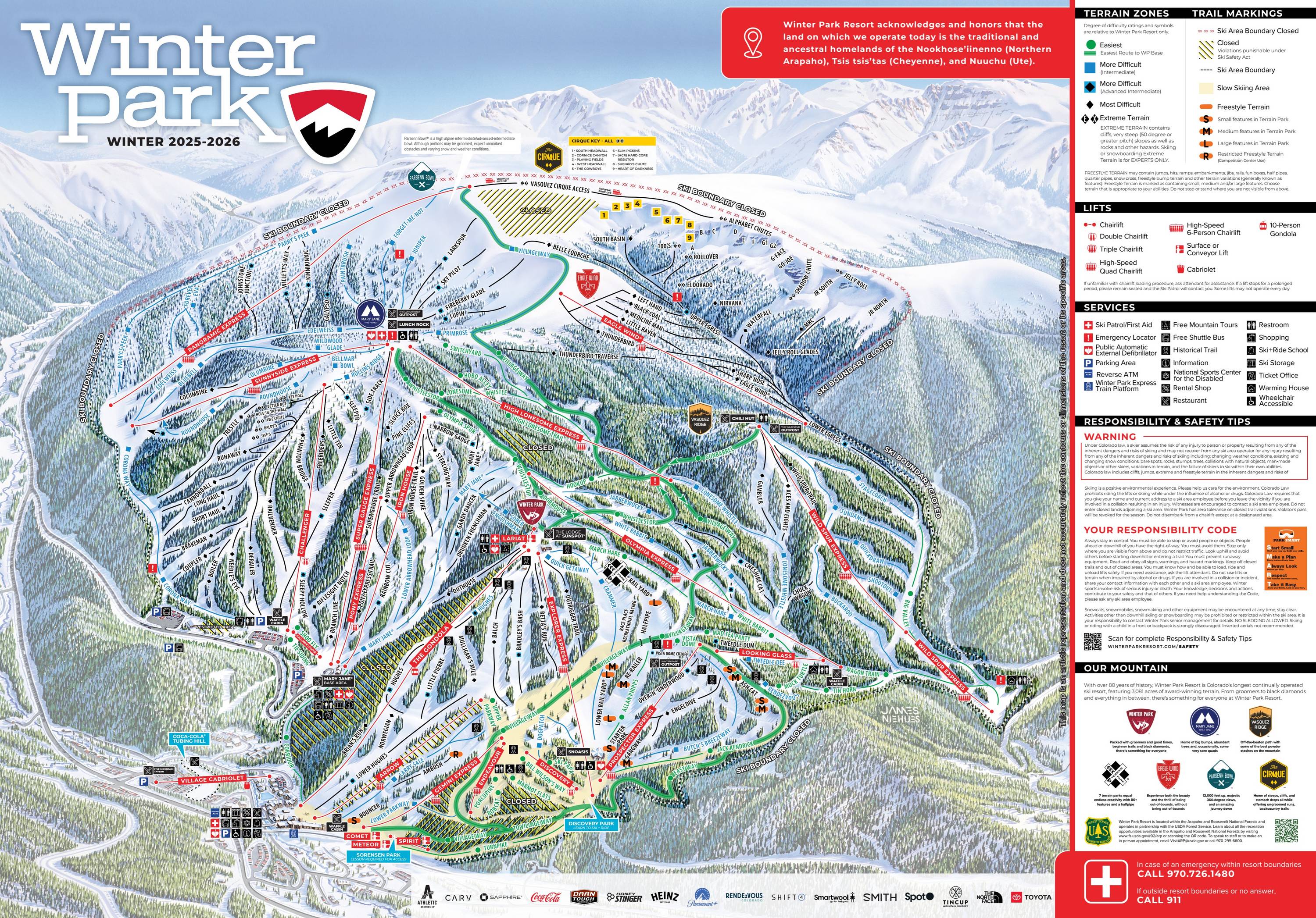 Der Pistenplan bildet das gesamte Winter Park Resort sehr gut ab. Es sind alle Pisten und Lifte mit eingezeichnet. Auf der Rückseite findet man Informationen zu den Restaurants, der Ski & Ride School, den Aktivitäten am Berg und weitere wichtige Informationen.