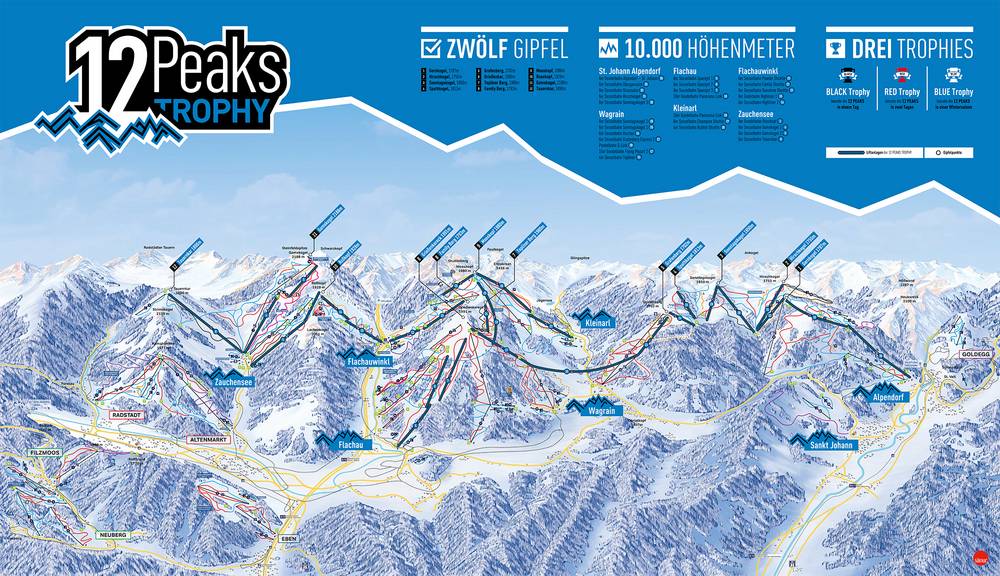 Die sportlichste Art, um die neuen Skiverbindung von Zauchensee von Alpendorf auszukosten! Die Challenge ist, zwölf Gipfel in möglichst wenigen Tagen zu schaffen. Dabei werden insgesamt 10.000 Höhenmeter gefahren und die schönsten Gipfel der Region besucht. Wer die Herausforderung in einem oder mehr Tagen schafft, erhält eine Trophäe - entsprechend des Schwierigkeitsgrads von Skipisten: Schwarz (12 Gipfel - 1 Tag), Rot (12 Gipfel - 2 Tage), Blau (12 Gipfel - 3 oder mehr Tage). Worauf wartest du?