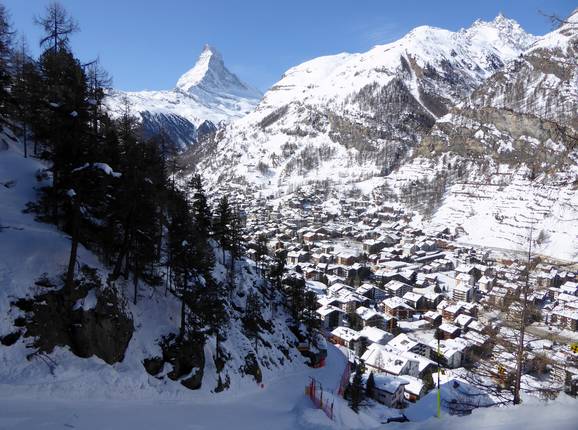 Zermatt liegt auf 1620 m und es stehen sehr viele Unterkünfte von der einfachen Pension bis hin zum 5-Sterne-Hotel zur Verfügung. Der Walliser Ort ist autofrei und man nimmt die elektrischen Skibusse zu den Skiliften. Direkt im Skigebiet kann man im Hotel Riffelhaus, der Ganegghütte, dem Kulmhotel Gornergrat, dem Riffelalp Resort (Europas höchstes 5-Sterne-Hotel auf 2222 m gelegen), dem Hotel Silvana oder dem Hotel Schwarzsee übernachten. Wer es ganz romantisch möchte kann im Iglu-Dorf Zermatt unterhalb des Gornergrats übernachten.