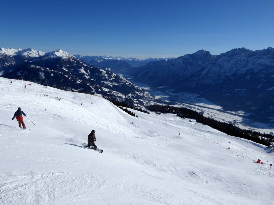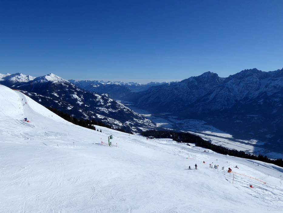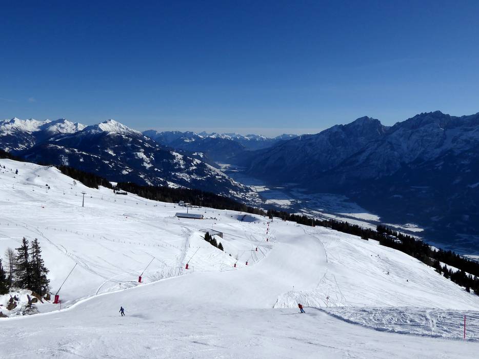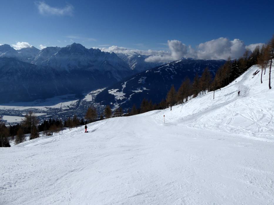 Herrlicher Blick von der mittelschweren Piste auf Lienz, den Hochstein und die Lienzer Dolomiten - Familienabfahrt