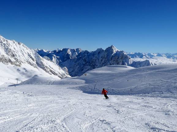 Die Zugspitze ist nicht direkt mit dem Skigebiet Garmisch-Classic verbunden. Man unternimmt eine ca. einstündige Fahrt mit der Zahnradbahn.