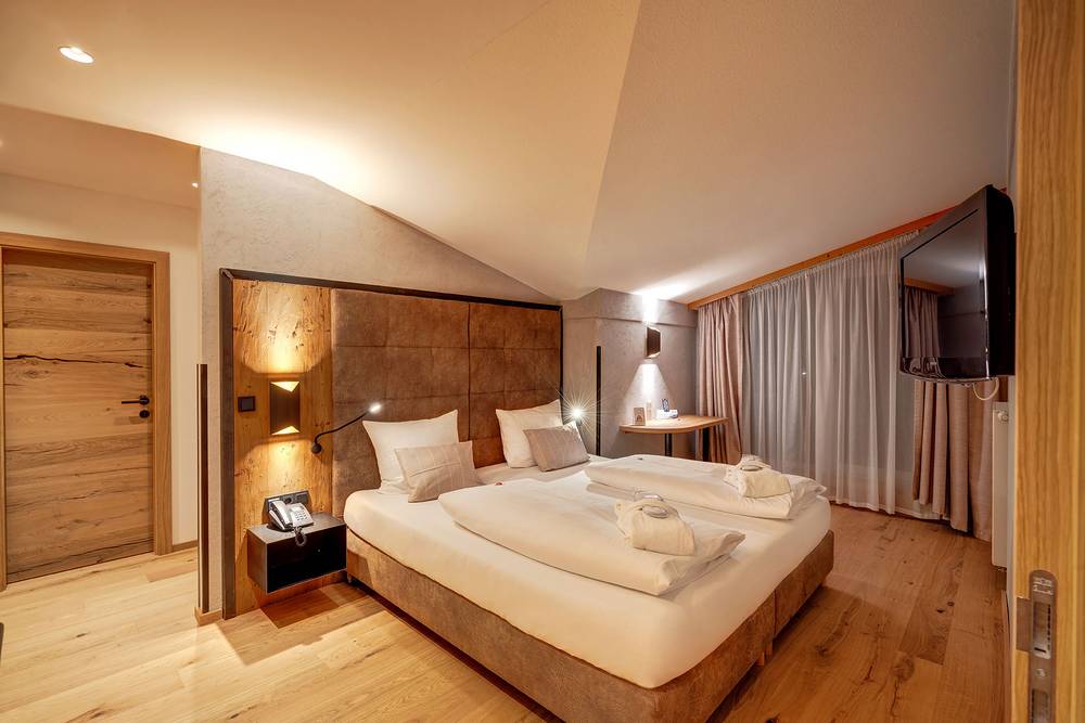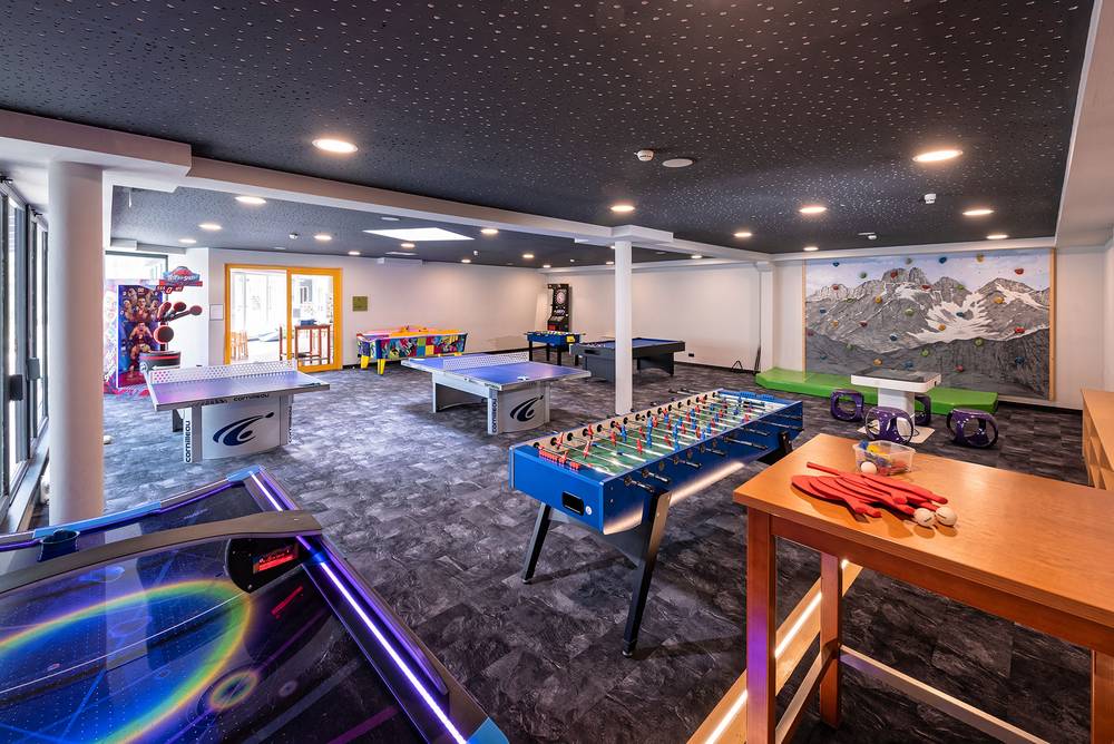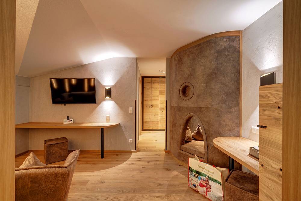 Im großen Eingangsbereich erwartet die Kinder eine Spielwiese mit großen Fliegenpilzen, riesige Legosteine zum Bauen und verschiedenste Schaukelmöglichkeiten. Die Zimmer und Suiten sind sehr bequem und geschmackvoll gestaltet worden. Familiensuiten im topmodernen Alpine-Style, Suiten für Großfamilien und Suiten für Singles mit Kind(ern) oder für Großeltern sind vorhanden. Die Zimmer sind sehr geräumig und man findet selbstverständlich alles, was für einen unbeschwerten Urlaub mit Kind oder Baby benötigt wird. Nichts, außer Windeln, muss von zu Hause mitgebracht werden!