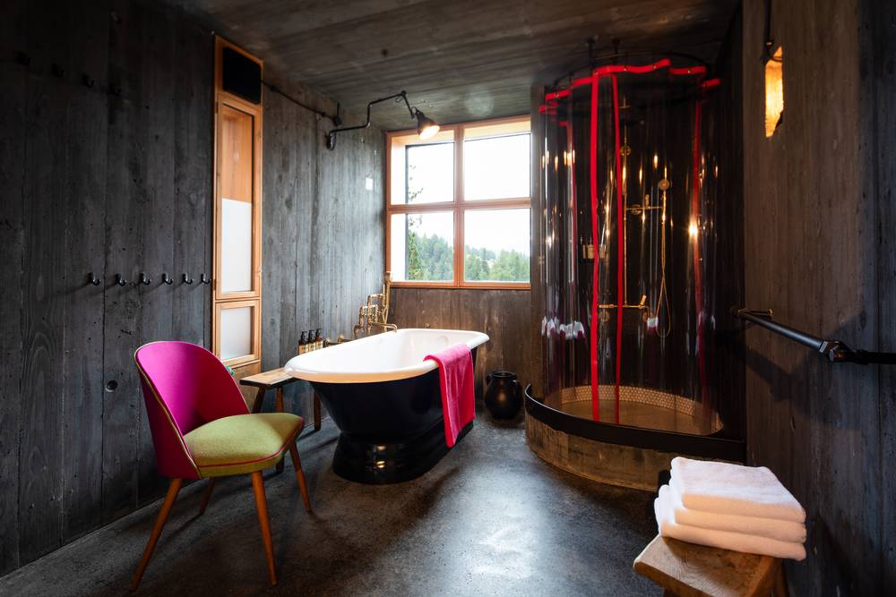 Jede Hütte überrascht: „Toni“ mit großem Saunabereich, „Luki“ mit Terrasse und gemütlicher Stube, „Franzi“ mit Holzlager und Zirbenwald-Blick aus der Sauna.