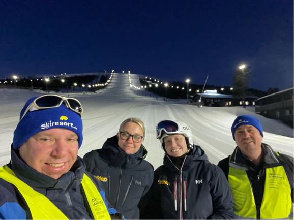 Vor dem Start in Stöten: Oliver Kern mit Jenny Bergqvist und My Berglund vom Skigebiet Stöten sowie Weltrekord-Team-Mitglied Patik Wegele.