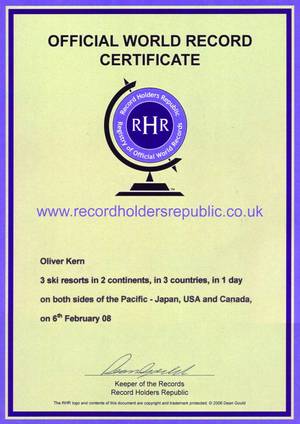 - Am 06.02.2008 war es soweit. An einem Tag über die Pisten in Japan, den USA und Kanada fegen - auf beiden Seiten des Pazifiks Skifahren – der Plan ist aufgegangen! Gutes Timing, gute Verbindungen, Ausdauer und etwas Glück haben den 3. Weltrekord gelingen lassen. Leider nicht so wie geplant, aber dennoch geschafft.